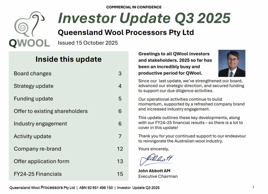 2025: Queensland Government provides grant to QWool to commence Bankable Feasibility Study for Stage 1a (Blackall Project).