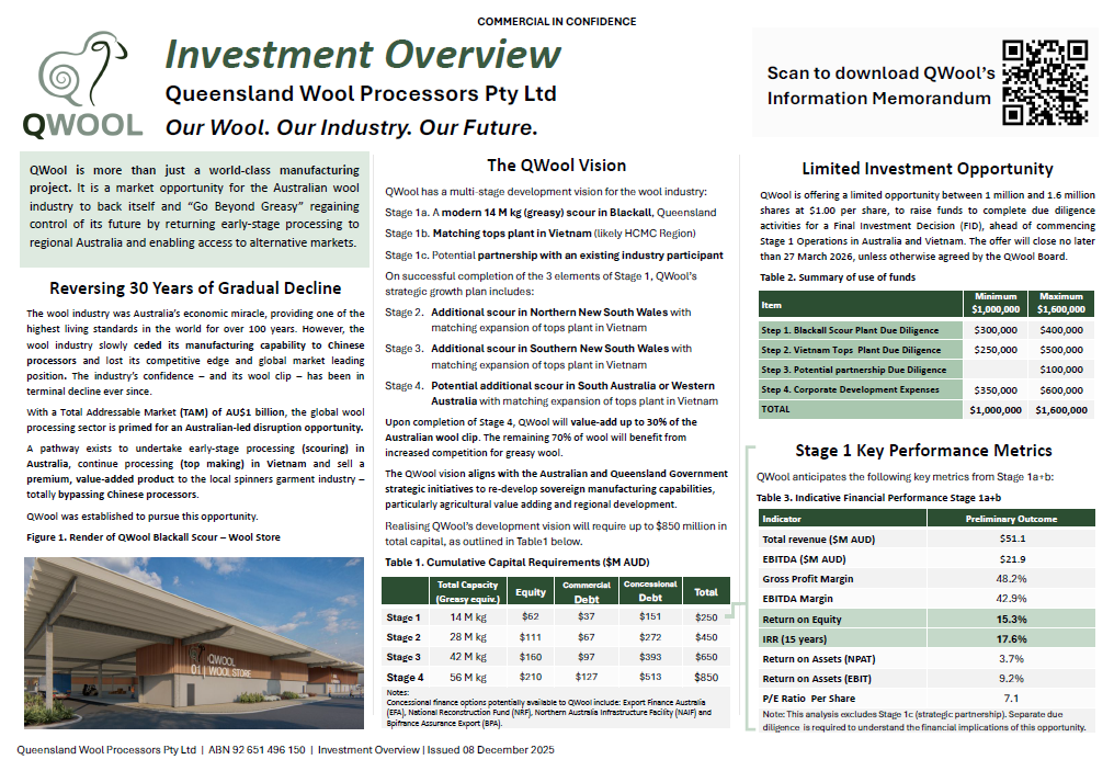 2025: QWool undertakes capital raise to complete Bankable Feasibility Study for Stage 1b (Tops Plant in Vietnam) and due diligence for Stage 1c (industry partnership).