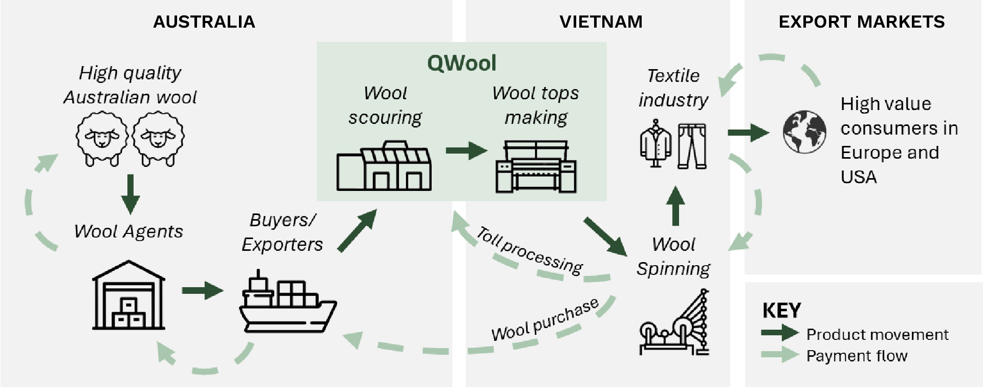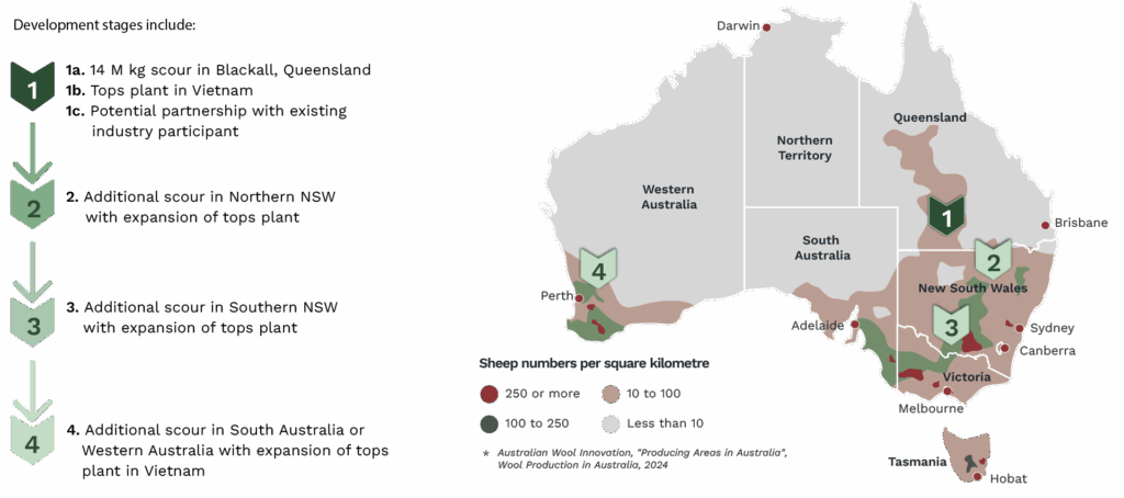QWool’s project plan includes building a new tops plant in Vietnam to turn the clean wool into a ready-to-spin product for the textile industry, creating a direct connection to key Asian garment manufacturers.